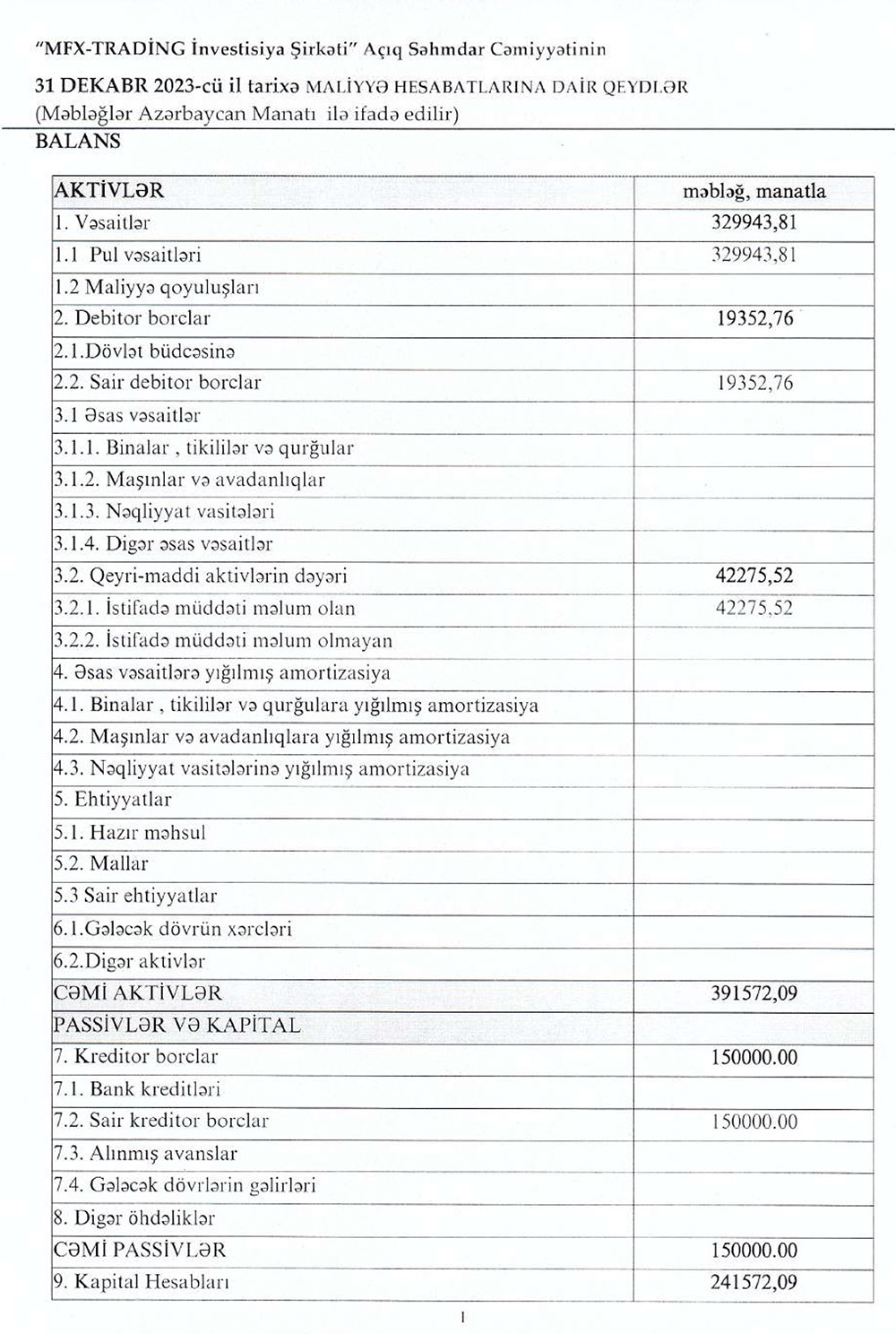 31 dekabr 2023-cü il tarixində “MFX-Trading İnvestisiya Şirkəti" ASC 392 min manat cəmi aktivlərə malik olub.