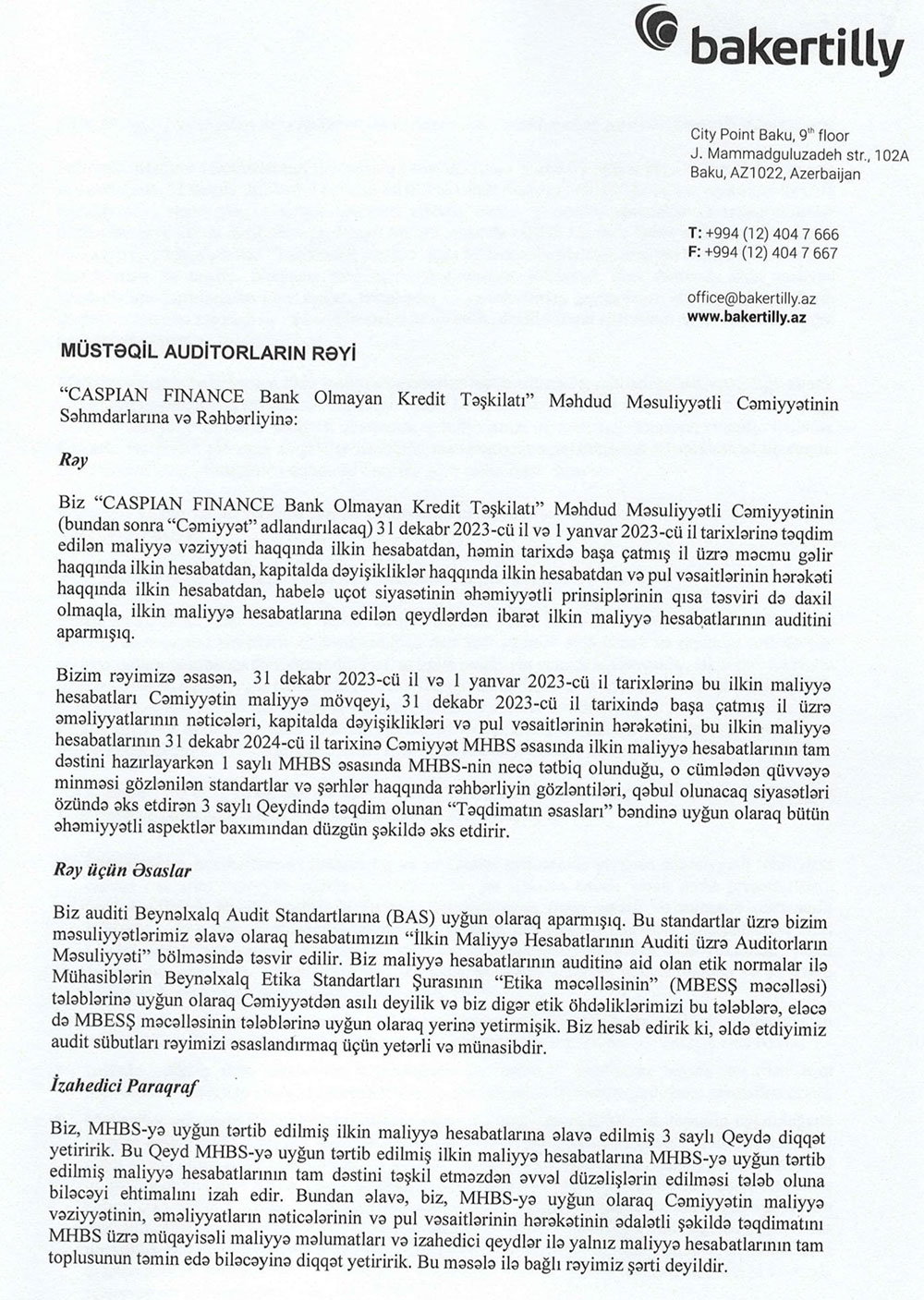 “CASPIAN FINANCE BANK OLMAYAN KREDİT TƏŞKİLATI” MMC 2023-cü il üzrə maliyyə göstəricilərini açıqladı “CASPIAN FINANCE BANK OLMAYAN KREDİT TƏŞKİLATI” MMC-nin 31 dekabr 2023-cü il tarixində bitən il üzrə maliyyə hesabatları.