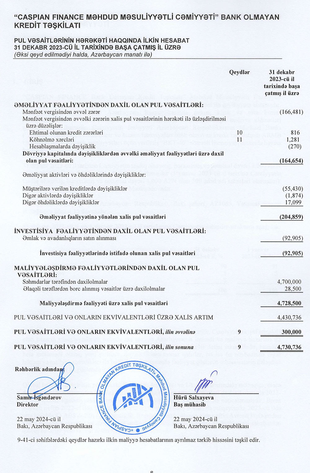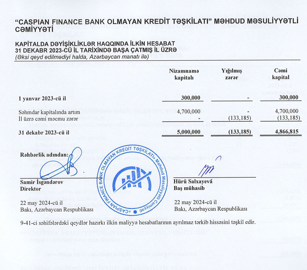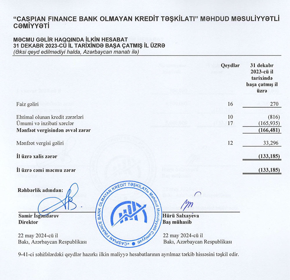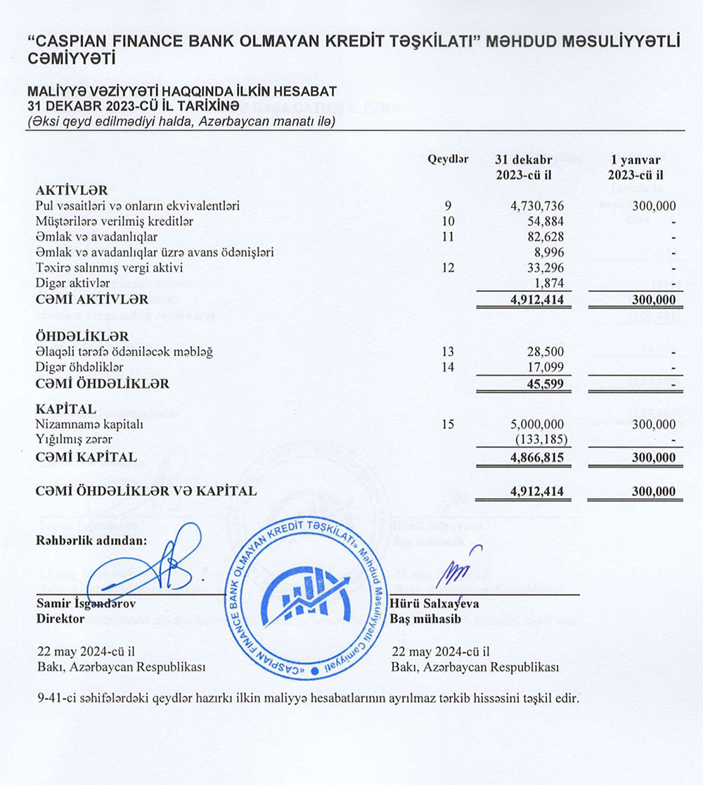 “CASPIAN FINANCE BANK OLMAYAN KREDİT TƏŞKİLATI” MMC 2023-cü il üzrə maliyyə göstəricilərini açıqladı