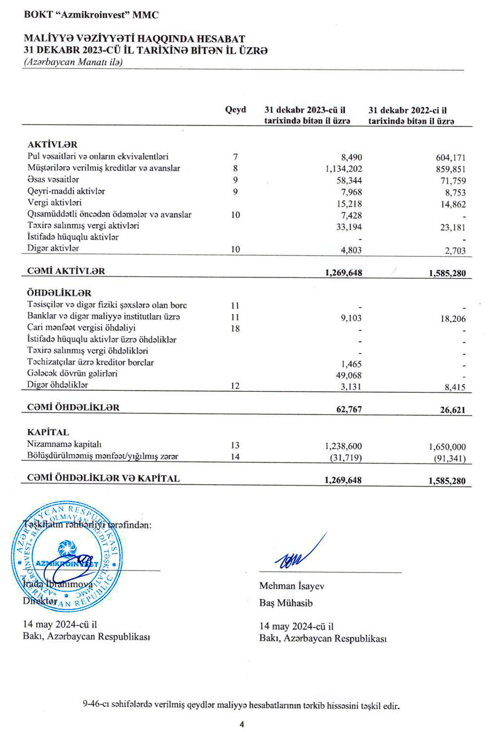 Ötən il BOKT "Azmikroinvest"in kredit portfeli (müştərilərə verilmiş kreditlər) 31,9% artaraq 31 dekabr 2023-cü il tarixində 1 milyon 134.min manata çatıb.