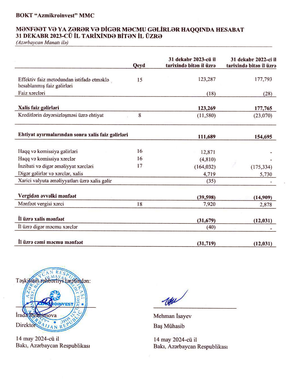 BOKT "Azmikroinvest" MMC 2023-cü ili 32 min manat xalis zərər ilə başa vurub. Kredit şirkəti 2022-ci ili 12 min manat xalis zərər ilə bağlamışdı. Beləliklə, ötən il BOKT "Azmikroinvest"in xalis zərəri təxminən 2,7 dəfə artıb.