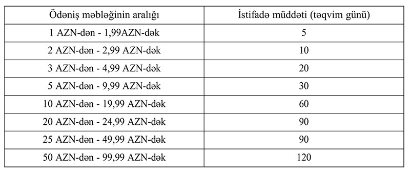 Qeyd edilib ki, bütün nominallı (1, 2, 3, 5, 10, 25, 50 və 100 AZN) ödəmə (danışıq) kartlarında yeni ödəmə kartının yükləmə müddəti ödəmə kartlarının nominalından asılı olaraq müəyyən edilən kartın istifadə müddəti + 180 gün kimi saxlanılır. Beləliklə də, abunəçi bu müddət ərzində yeni ödəmə kartı yükləyib istifadə imkanını yeni müddətə artırmaqla, eyni zamanda həmin yeni müddət bitənədək həm daha əvvəl yüklənmiş və istifadə edilməmiş məbləğlərdən, həm də yeni yüklədiyi ödəmə kartının məbləğindən istifadə imkanına malik olacaq.