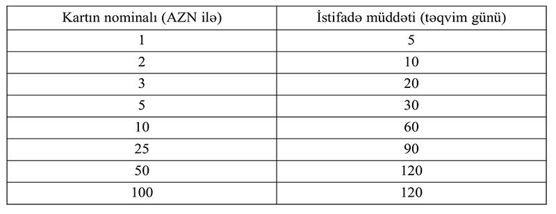 Beləliklə, 1 iyul 2024-cü il tarixindən etibarən 1 manatlıq ödəniş (danışıq) kartının istifadə müddəti 5 gün (hazırda 7 gün), 2 manatlıq ödəniş (danışıq) kartının istifadə müddəti 10 gün (hazırda 14 gün), 3 manatlıq ödəniş (danışıq) kartının istifadə müddəti 20 gün (hazırda 30 gün), 5 manatlıq ödəniş (danışıq) kartının istifadə müddəti 30 gün (hazırda 60 gün), 10 manatlıq ödəniş (danışıq) kartının istifadə müddəti 60 gün (hazırda 90 gün), 25 manatlıq ödəniş (danışıq) kartının istifadə müddəti 90 gün (hazırda 180 gün), 50 manatlıq ödəniş (danışıq) kartının istifadə müddəti 120 gün (hazırda 180 gün), 100 manatlıq ödəniş (danışıq) kartının istifadə müddəti 120 gün (hazırda 180 gün) olacaqdır. Qısası, 1 iyul 2024-cü il tarixindən etibarən istifadə müddətləri azalacaqdır.