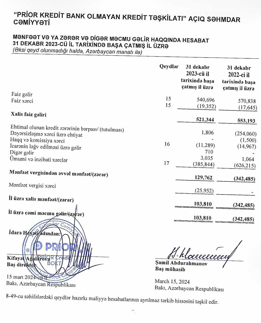 Marja.az xəbər verir ki, "Prior Credit"in faiz gəlirləri 2022-ci ildə 571 min manat ikən, 2023-cü ildə 541 min manat təşkil edib.