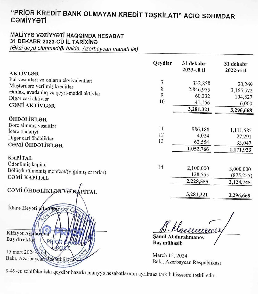 "Prior Credit BOKT" ASC 2023-cü ili 104 min manat xalis mənfəət ilə başa vurub. Kredit şirkəti 2022-ci ili 342 min manat xalis zərər ilə bağlamışdı. 2022-ci ildə zərər ehtimal olunan kredit zərərələri üçün yaradılmış ehtiyat ilə əlaqədar idi. 2023-cü ildə ehtiyatdan vəsait azad olub.