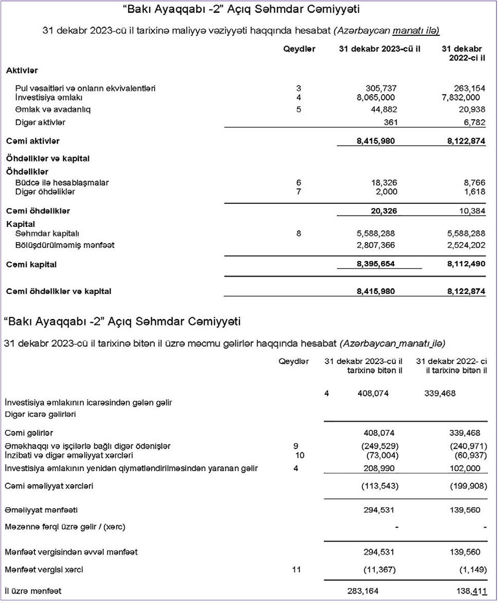 Marja.az xəbər verir ki, "Bakı Ayaqqabı-2" ötən il də əsas fəaliyyətdən gəlir əldə etməyib. Şirkət gəlirini əmlakın icarəsindən təmin edir. "Bakı Ayaqqabı-2"nin investisiya əmlakının icarəsindən gəliri 2022-ci ildə 339 min 468 manat ikən, 2023-cü ildə 408 min 74 manat təşkil edib.