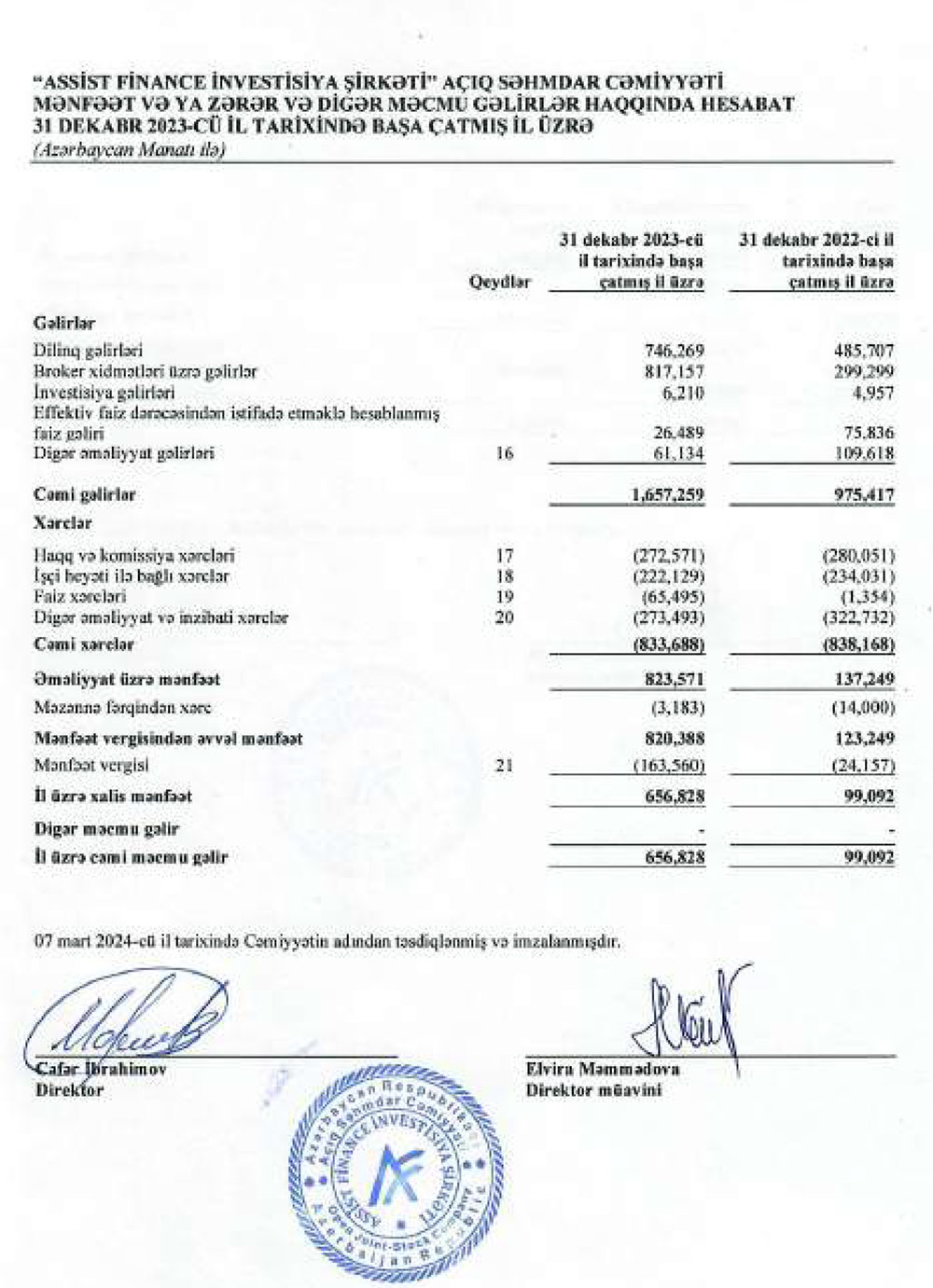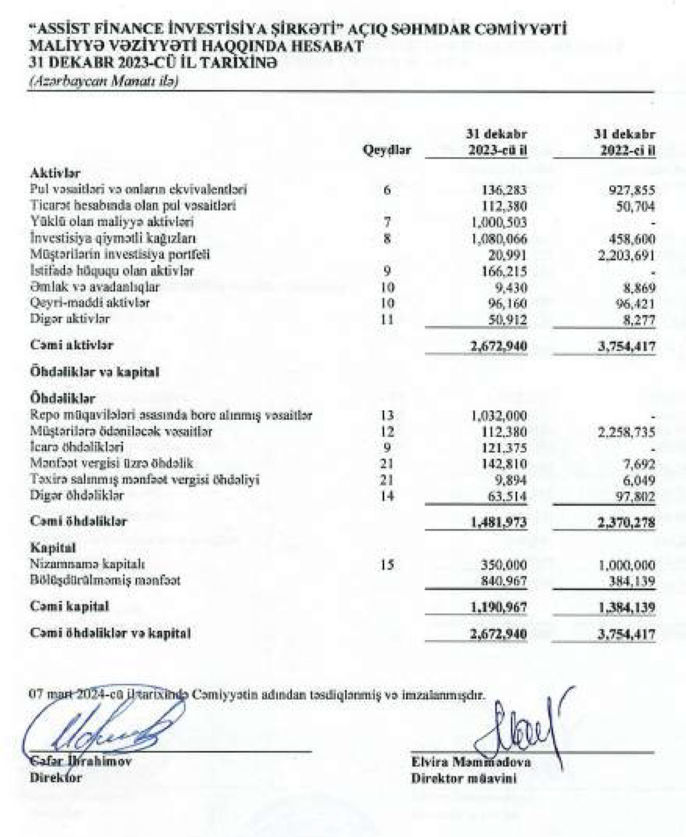 "Assist Finance İnvestisiya Şirkəti" ASC 2023-cü ili 657 min manat xalis mənnfət ilə başa vurub. Şirkət 2022-ci ili 99 min manat xalis mənfəət ilə bağlamışdı. Beləliklə, ötən il "Assist Finance"ın xalis mənfəəti 6,6 dəfə artıb.