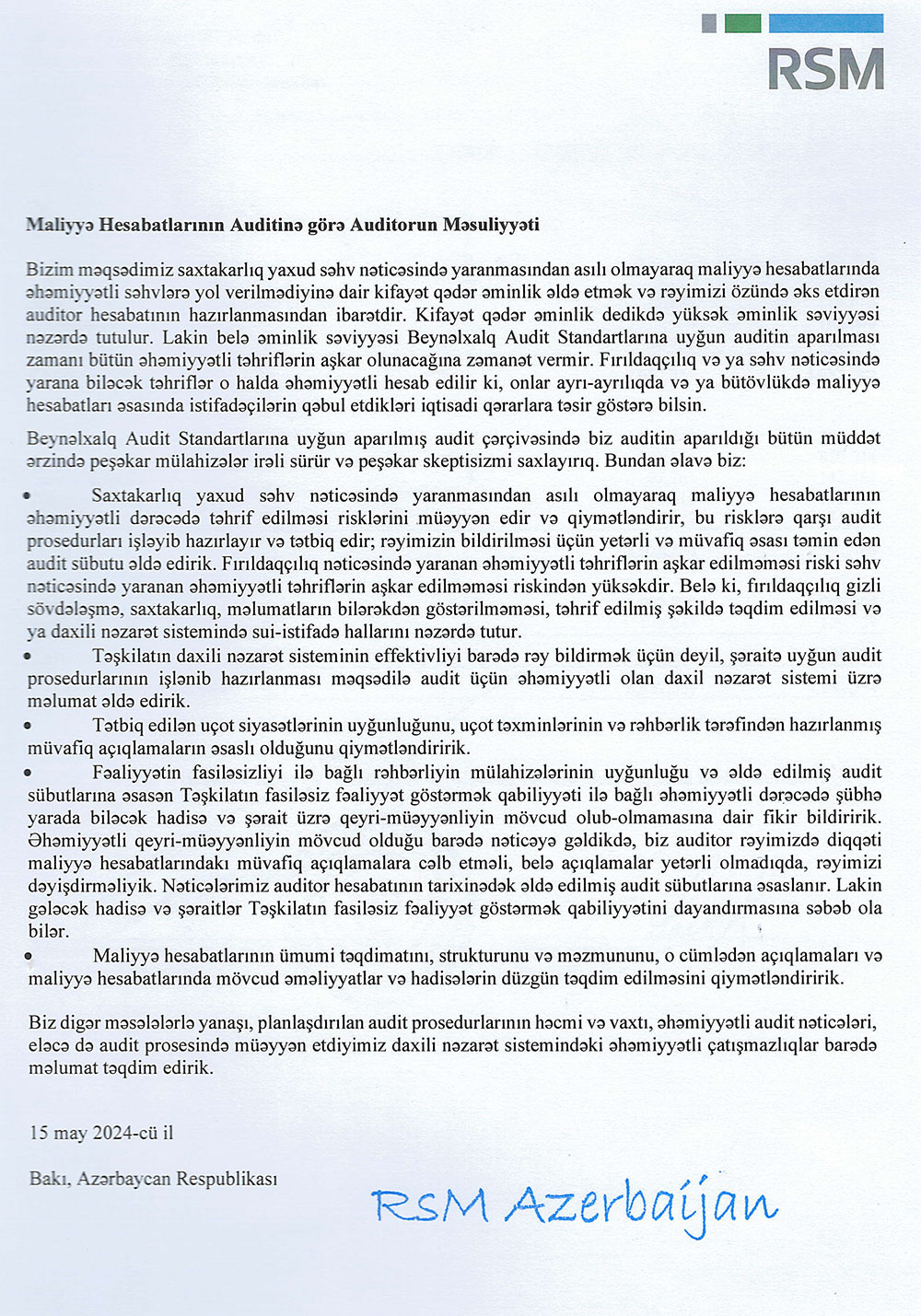 "Brand Credit Bank Olmayan Kredit Təşkilatı" MMC 31 dekabr 2023-cü il tarixində bitən il üzrə maliyyə hesabatlarını dərc edib.