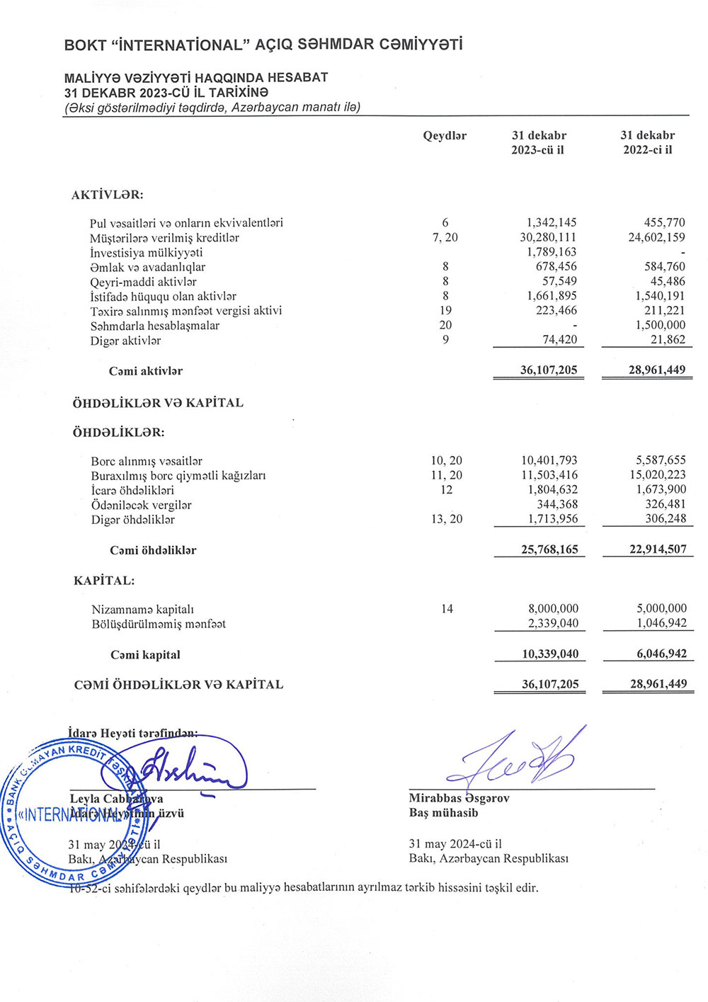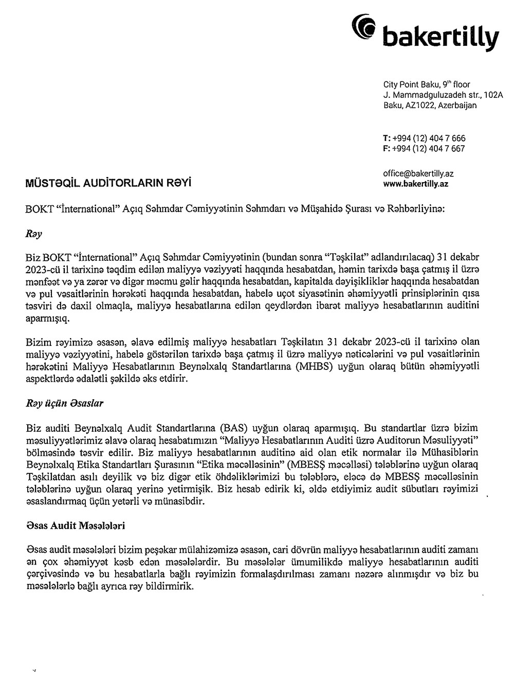 BOKT “İnternational” ASC-nin kənar audit şirkəti tərəfindən təsdiqlənmiş 2023-cü il üzrə maliyyə hesabatını açıqlayıb. Hesabat Mühasibat uçotunun "Mühasibat uçotu haqqında" Azərbaycanın "Mühasibat uçotu haqqında" Qanununun, Maliyyə Hesabatlarının Beynəlxalq Standartlarının (MHBS) tələbləri çərçivəsində tamlığı, aidiyyəti maliyyə hesabatlarının hazırlanması və bu hesbatların MHBS-yə uyğunluğuna dair rəyin verilməsi beynəlxalq audit şirkəti “Baker Tilly Azerbaijan” tərəfindən təsdiqlənib.