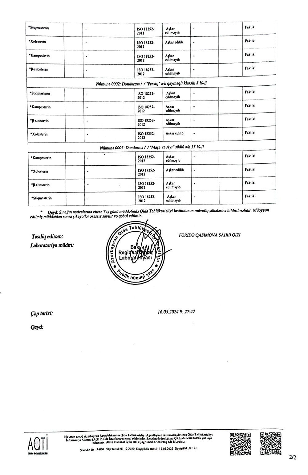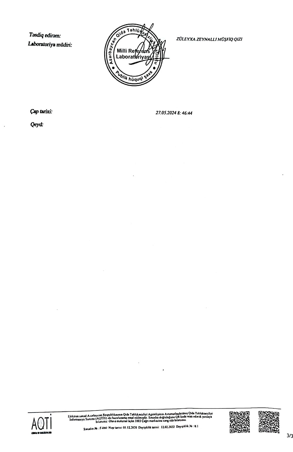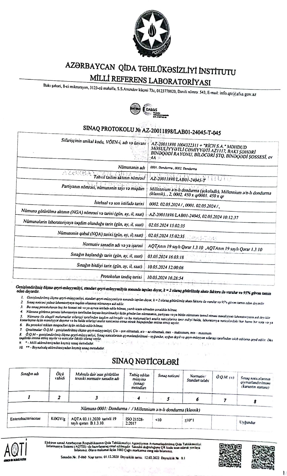Eyni zamanda bildiririk ki, məhsullarımızın hazırlanması üçün istifadə etdiyimiz xammal mütləq şəkildə AQTA-nın laboratoriyalarında yoxlamadan keçirildikdən və müsbət nəticə alındıqdan sonra istehsalımızda istifadə edilir. O cümlədən, günlük hazırlanan hər məhsulun hər partiyasından nümunə götürülərək AQTA-nın laboratoriyasına göndərilir və uyğunluq cavabı gəldikdən sonra qablaşdırılır (Sınaq nəticələrindən nümunə əlavə olunur) Mövcud vəziyyətin səbəbləri bizim şirkətimiz tərəfindən də araşdırılmağa başlanmışdır, məhsulda bakteriyanın olması onun saxlanılma şəraitinə və ya daşınma zamanı yol verilən pozuntulardan qaynaqlana bilər. Bizim şirkətə məxsus avtomobillərlə daşınmış və şirkətə məxsus soyuducularımızda saxlanılan məhsullarda bu hal mümkün deyildir.
