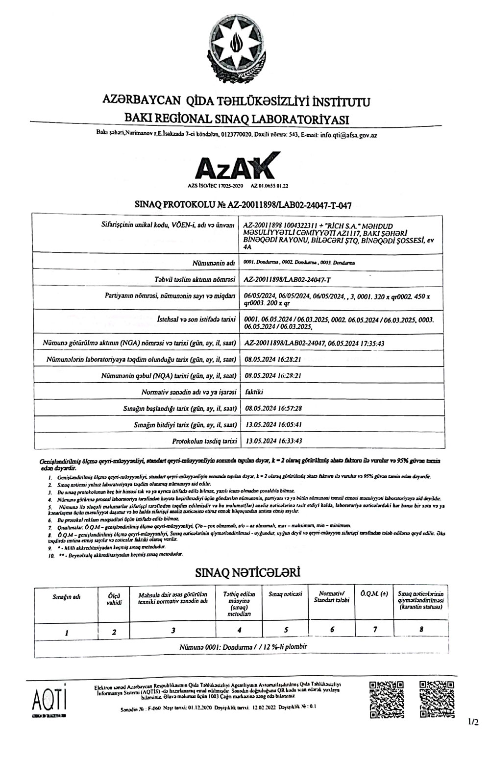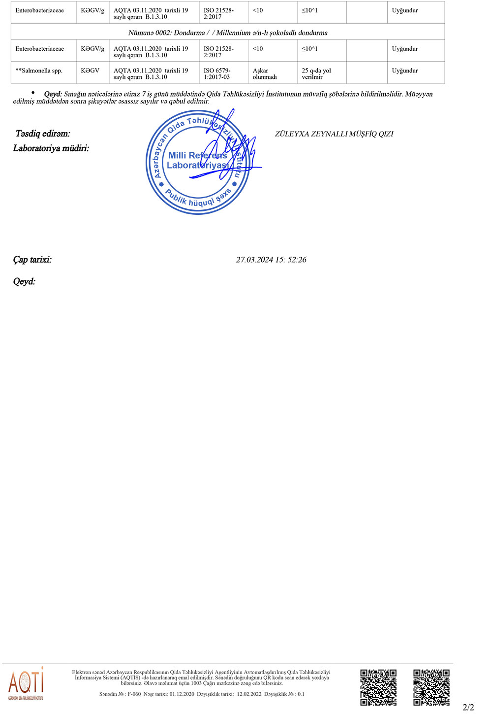Mətbuatda adı çəkilən məhsullarımızda aşkar olunduğu bildirilən bakteriyanın məhsulumuzda olmasının qeyri-mümkün olduğunu qətiyyətlə bildiririk. Buna sübutumuz son on gün ərzində müəssisəmizdə yoxlamada olan AQTA nümayəndələrinin müəssisəmizin anbarından və istehsalat sahəsindən götürdükləri nümunələrin laboratoriya nəticələridir (AQTA-nın sınaq nəticələrini əlavə olunur). Nümunələrdən də göründüyü kimi müəssisəmizdə olan xammallarda, hazır məhsullarda və dəzgahlarda heç bir bakteriya aşkarlanmamışdır.