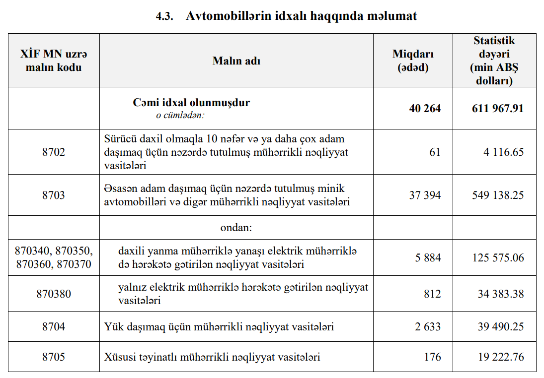 2023-cü ilin ilk 5 ayında Azərbaycana 611 milyon 968 min dollar dəyərində 40 min 264 ədəd nəqliyyat vasitəsi idxal olunmuşdu.