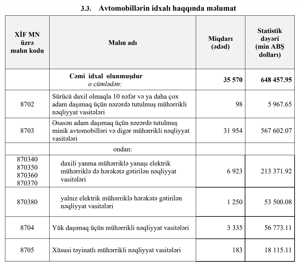 2024-cü ilin ilk 5 ayında (yanvar-may) Azərbaycana 648 milyon 458 min dollar dəyərində 35 min 570 ədəd nəqliyyat vasitəsi idxal olunub.