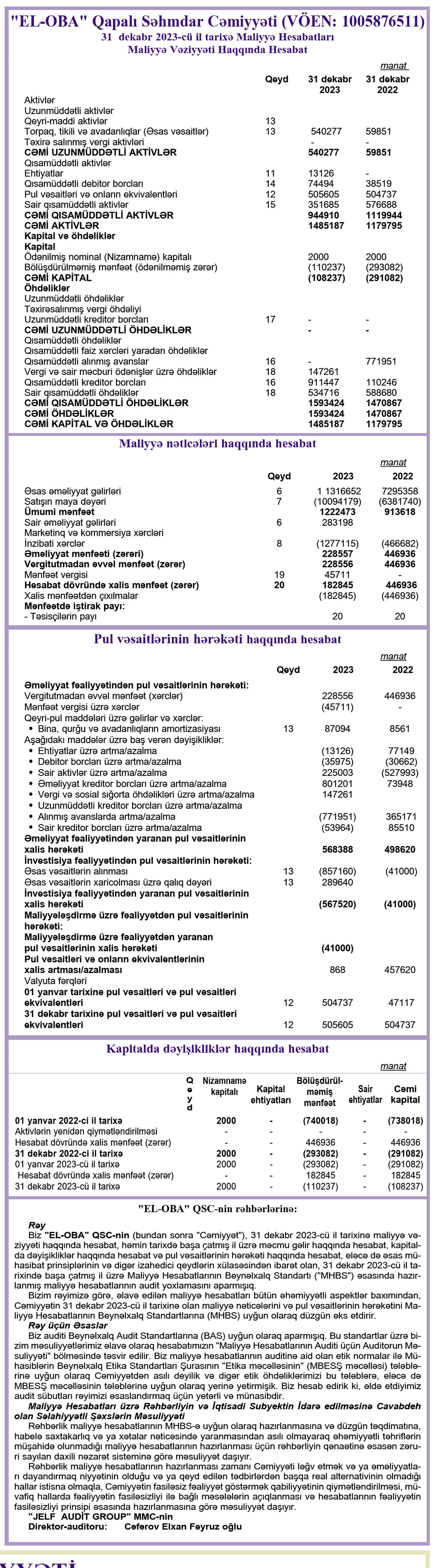 11 milyon 317 min qazanıb, 11 milyon 134 min xərcləyib. Xalis qazanc cəmi 183 min manat olub.Dövlət qrumlarının tender müsabiqələrində tez-tez qalib elan olunan və əsasən yemək təchizatı fəaliyyətilə məşğul olan "EL-OBA" QSC 2023-cü ili 183 min manat xalis mənfəət ilə başa vurub. Şirkət 2022-ci ili 447 min manat xalis mənfəət ilə bağlamışdı.