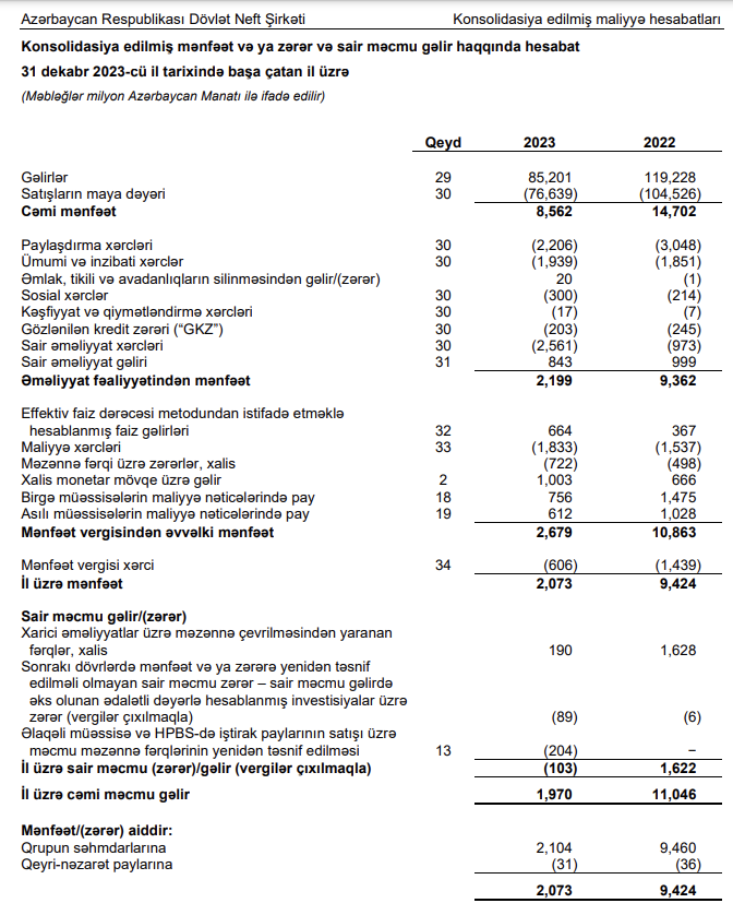 Şirkətin əsas əməliyyat gəlirləri (neft, qaz və neft məhsulları satışından) 2022-ci ildə 119 milyard 228 milyon manat ikən, 2023-cü ildə 85 milyard 201 milyon manata düşüb (34 milyard 27 milyon manat və ya 28,5% azalıb).