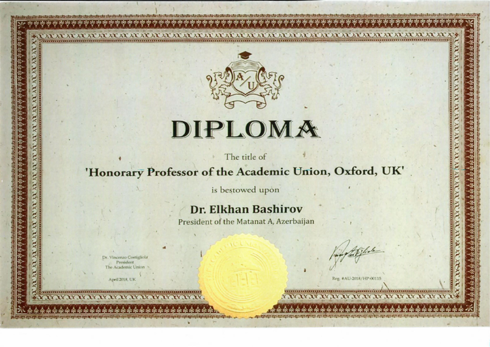 “Matanat A” Şirkətlər Qrupunun Müşahidə Şurasının sədri, Azərbaycan Tikinti Materialları İstehsalçıları Assosiasiyasının (ATMİA) sədri, Texnika elmləri üzrə fəlsəfə doktoru Elxan Bəşirov Böyük Britaniyanın Oksford Akademik Birliyinin (Honorary Professor of the Academic Union, Oxford, UK) Fəxri professoru adına layiq görülüb.