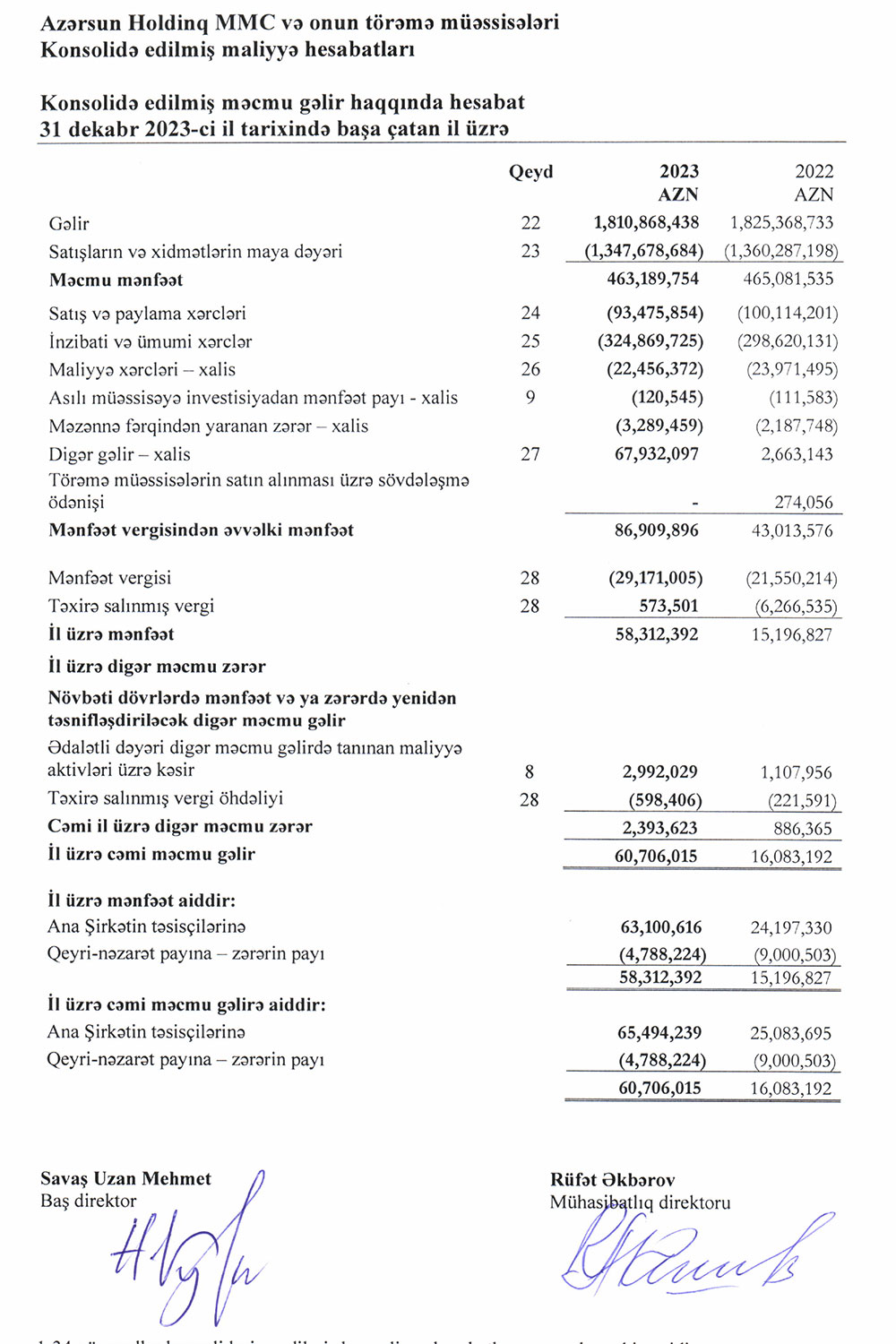Azərbaycanda iri qida məhsulları istehsalçısı olan "Azərsun Holdinq" MMC 2023-cü ili 58 milyon 312 min manat xalis mənfəət ilə başa vurub. Holdinq 2022-ci ili 15 milyon 197 min manat xalis mənfəət ilə bağlamışdı. Beləliklə, ötən il "Azərsun Holdinq"in xalis mənfəəti 3,8 dəfə artıb. Xalis mənfəətin artması 2023-cü ildə holdinqin əsas əməliyyat gəlirindən başqa 67 milyon 932 min manat digər gəlir əldə etməsi və təxirə salınmış vergi öhdəliyinin olmaması ilə əlaqədardır.