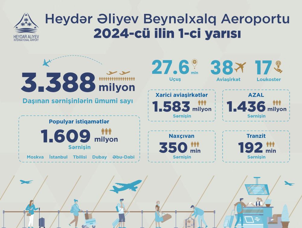 Bakı hava limanında 2024-cü ilin birinci yarısında sərnişin axını 40% artıb2024-cü ilin 6 ayı ərzində Heydər Əliyev Beynəlxalq Aeroportunun sərnişin dövriyyəsi əhəmiyyətli şəkildə artaraq 3 milyon 388 milyon nəfərə çatıb.