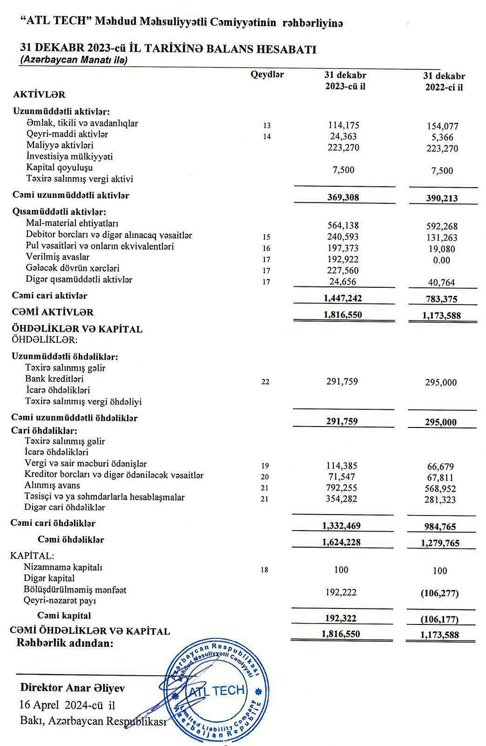 Kompüterərin, avadanlıqların və proqram təminatlarının topdan satışı fəaliyyətləri ilə məşğul olan "ATL Tech" MMC şirkəti 2023-cü ili 367 min manat xalis mənfəət ilə başa vurub. Şirkət 2022-ci ili 282 min manat xalis zərər ilə bağlamışdı. Beləliklə, ötən il "ATL Tech" zərərdən mənfəətə keçib.
