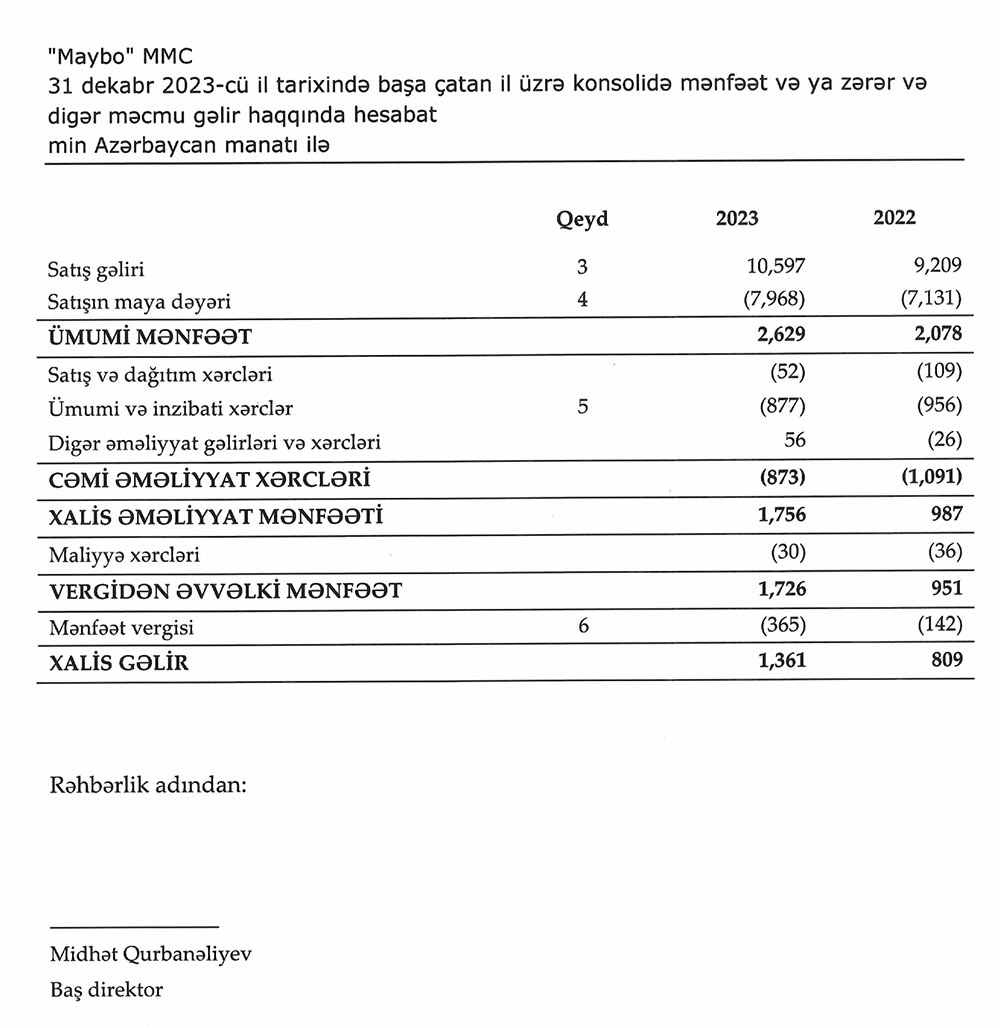 "Maybo" MMC 2023-cü ili 1 milyon 361 min manat xalis mənfəət ilə başa vurub. Şirkət 2022-ci ili 809 min manat xalis mənfəət ilə bğlamışdı. Beləliklə, ötən il "Maybo" şirkətinin xalis mənfəəti 552 min manat və ya 68,2% artıb.