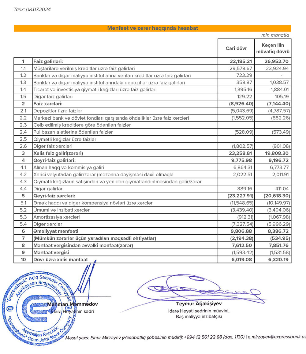 Bank 2023-cü ilin eyni dövrünü 6 milyon 320 min manat xalis mənfəət ilə bağlamışdı. Beləliklə, "Expressbank"ın xalis mənfəəti cari ilin ilk yarısında ötən ilin eyni dövrü ilə müqayisədə 301 min manat və ya 4,8% azalıb. Xalis mənfəətin cüzi azalması ehtiyata ayrılan vəsaitin artırılması ilə əlaqədardır. İlk yarımildə "Expressbank"ın gəlirlərində artım baş verib.