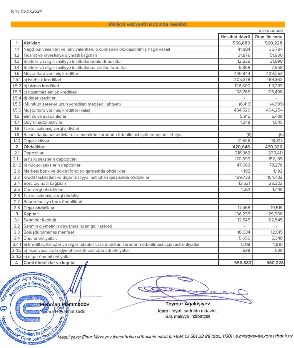 30 iyun 2024-cü il tarixində “Expressbank” ASC 556 milyon 883 min manat cəmi aktivlərə, 420 milyon 648 min manat cəmi öhdəliklərə malik olub. O cümlədən, cəmi öhdəliklərin 218 milyon 362 min manatını depozitlər təşkil edib. İlk 6 ayda bankda fiziki şəxslərin cəmi depozitləri 18 milyon 564 min manat artaraq 170 milyon 699 min manata çatıb.
