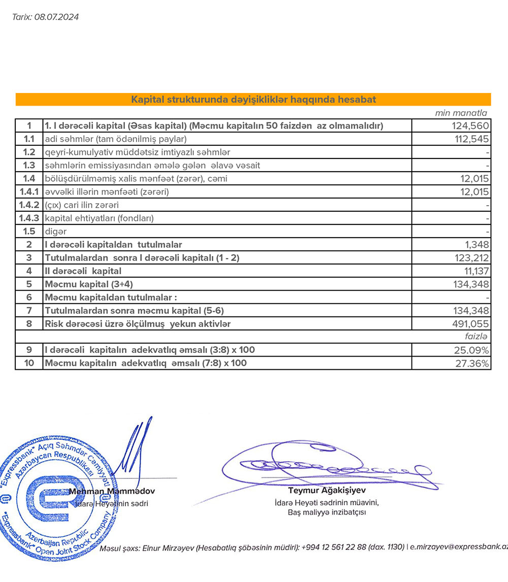 30 İyun 2024-cü il tarixində “Expressbank” ASC 134 milyon 348 min manat məcmu kapitala malik olub. Bank ötən ilin eyni tarixində 121 milyon 375 min manat məcmu kapitala malik idi.