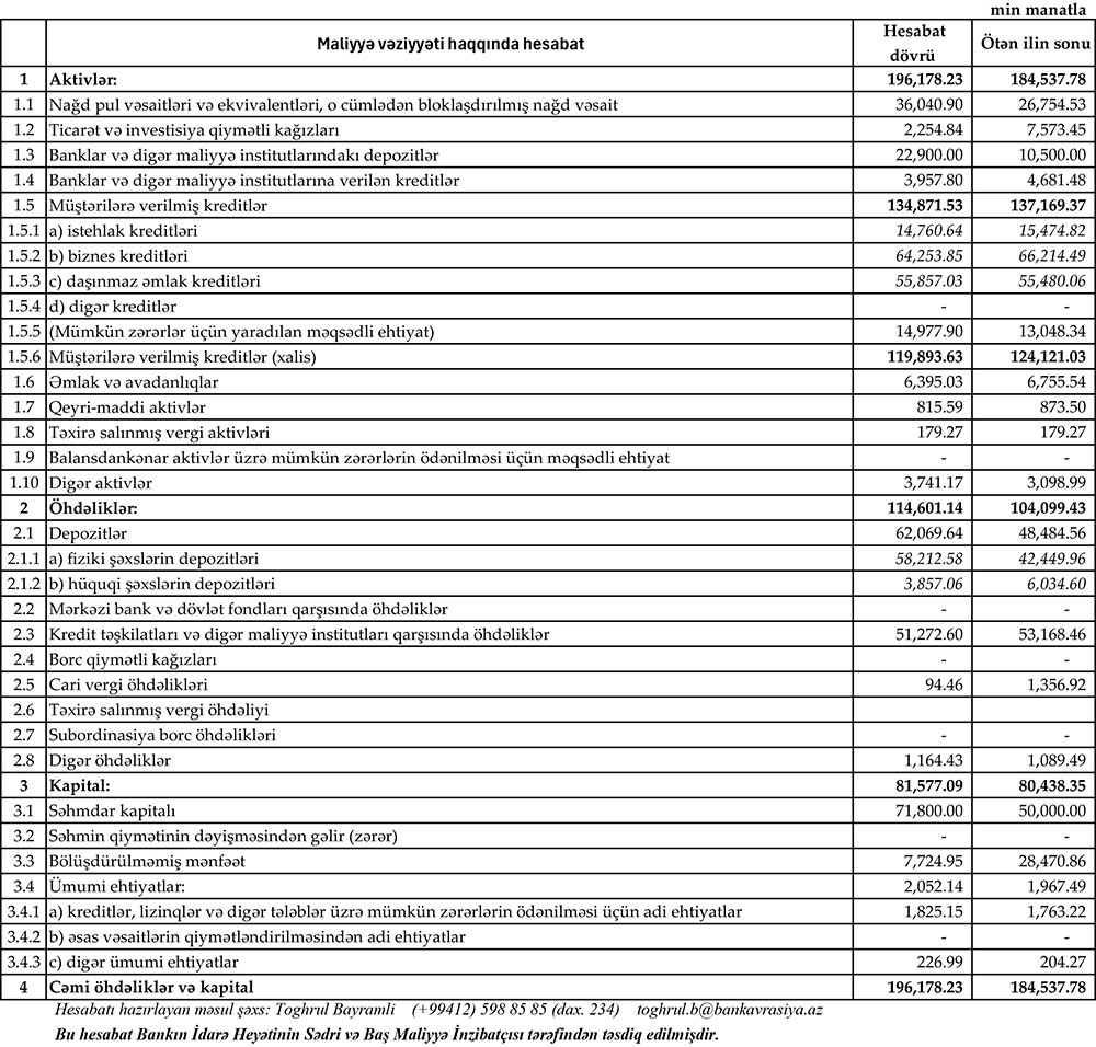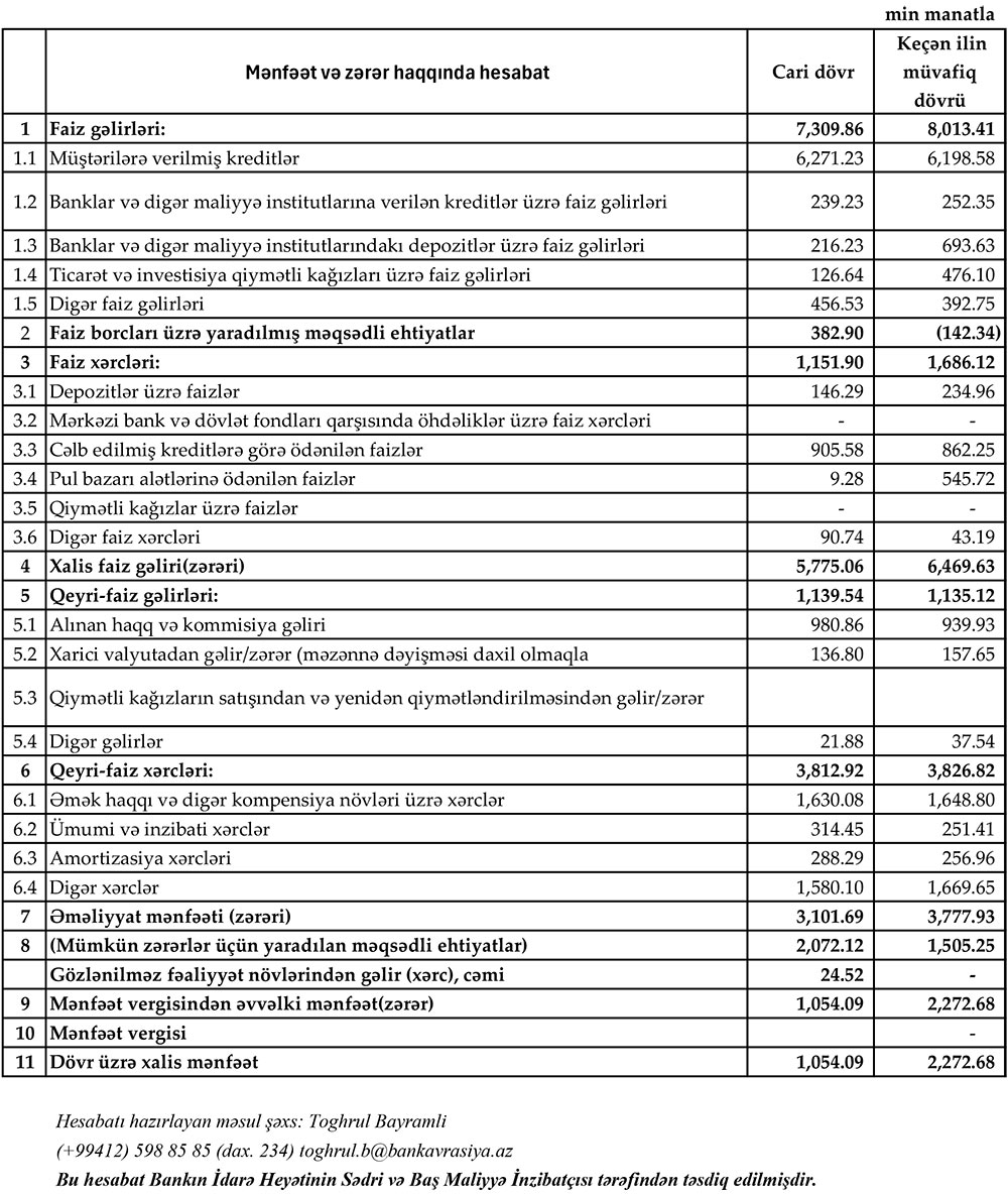 Həmçinin, ilk 6 ayda Bank əməliyyat mənfəətindən 2 milyon 72 min manat mümkün zərərlər üçün yaradılan məqsədli ehtiyata ayırıb. 2023-cü ilin eyni dövründə "Bank Avrasiya" əməliyyat mənfəətindən 1 milyon 505 min manat ehtiyata ayırmışdı.