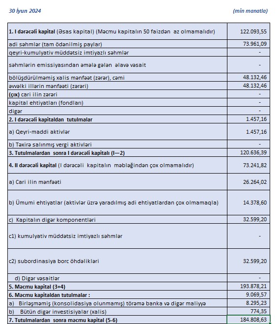 30 İyun 2024-cü il tarixində "Bank Respublika" 184 milyon 809 min manat məcmu kapitala malik olub. Bank ötən ilin sonunda 165 milyon 910 min manat məcmu kapitala malik idi.