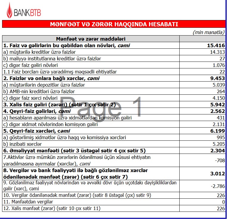 Müqayisə üçün qeyd edək ki, 2023-cü ilin ilk 6 ayı ərzində Bank "BTB"nin cəmi əməliyyat gəlirləri (faiz və qeyri-faiz gəlirləri) 16 milyon 856 min manat, əməliyyat xərcləri (faiz və qeyri-faiz xərcləri) 15 milyon 951 min manat, gəlirlər xərcləri üstələdiyindən əməliyyat mənfəəti 905 min manat təşkil etmişdi. Eyni zamanda, mümkün zərərlər üçün yaradılan məqsədli ehtiyatdan azad olan 2 milyon 252 min manat mənfəətə əlavə olunmuşdu. Vergilər və bank fəaliyyəti ilə bağlı gözlənilməz xərclər ödənilənədək mənfəət 3 milyon 157 min manat olmuşdu.