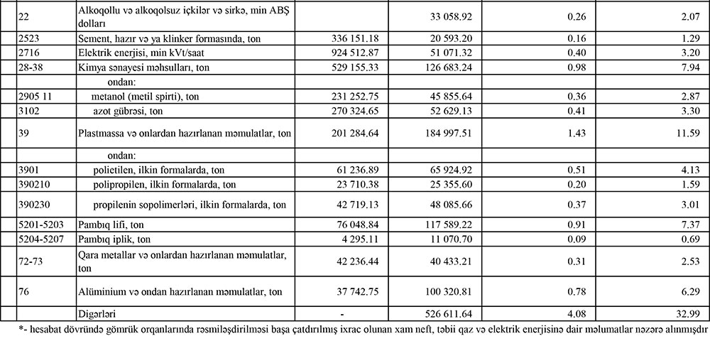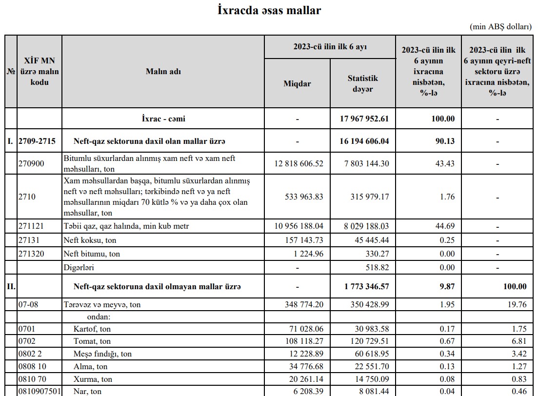 O cümlədən, xam neft ixracının dəyəri 791 milyon 41 min dollar azalaraq 7 milyard 12 milyon 103 min dollara, təbii qaz ixracının dəyəri 3 milyard 960 milyon 641 min dollar azalaraq 4 milyard 68 milyon 547 min dollara düşüb. 2023-cü ilin 1-ci yarısında Azərbaycandan 7 milyard 803 milyon 144 min dollar dəyərində xam neft, 8 milyard 29 milyon 188 min dollar dəyərində təbii qaz ixrac edilmişdi.