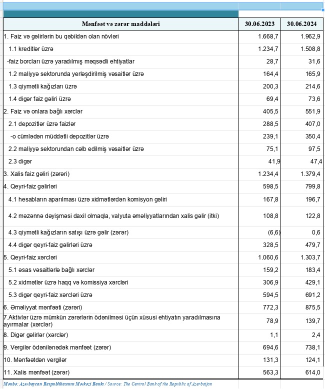 2024-cü ilin ilk 6 ayı ərzində (yanvar-iyun) Azərbaycandakı banklar kreditlər üzrə 1 milyard 508 milyon 767 min manat məbləğində faiz gəlirləri əldə ediblər.