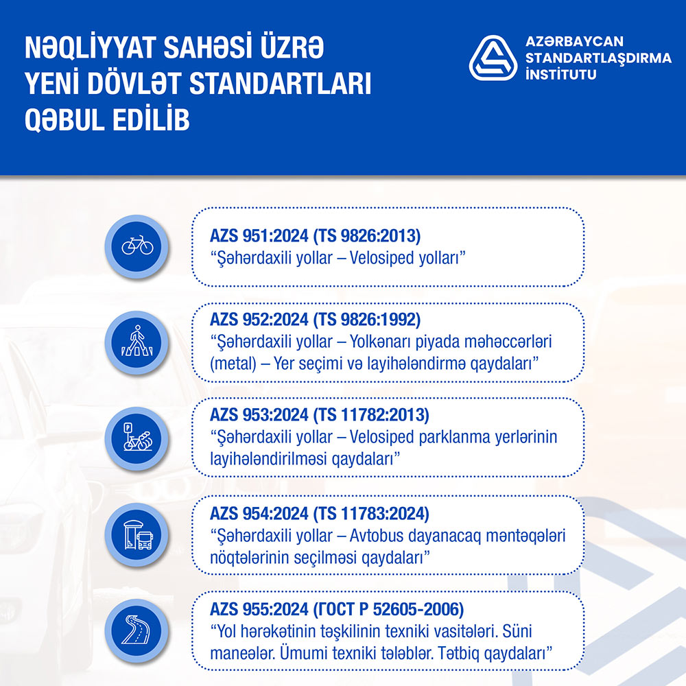 Yeni dövlət standartlarının tətbiqi şəhər ərazisində nəqliyyat yollarına dair tələbləri, velosiped parklanma yerlərinin layihələndirilməsi qaydalarını, eyni zamanda ümumi nəqliyyata nəzərən magistral üzərində şəhərdaxili avtobus dayanacaq məntəqələrinin yerinin seçilməsini, dayanacağın növünü və istismar qaydalarını müəyyən edir.İqtisadiyyat Nazirliyi yanında Antiinhisar və İstehlak Bazarına Nəzarət Dövlət Xidmətinin tabeliyində olan Azərbaycan Standartlaşdırma İnstitutu (AZSTANDART) tərəfindən TS 9826 “Şehiriçi yollar – Bisiklet yolları” türk standartının əsasında AZS 951:2024 (TS 9826:2013) – “Şəhərdaxili yollar – Velosiped yolları”, TS 9827 “Şehiriçi yollar – Yaya korkulukları, yol kenarı için (metal) yer seçimi ve tasarım kuralları” standartının əsasında AZS 952:2024 (TS 9826:1992) – “Şəhərdaxili yollar – Yolkənarı piyada məhəccərləri (metal) – Yer seçimi və layihələndirmə qaydaları”, TS 11782 “Şehiriçi yollar – Bisiklet park tesisleri tasarım kuralları” standartının əsasında AZS 953:2024 (TS 11782:2013) – “Şəhərdaxili yollar – Velosiped parklanma yerlərinin layihələndirilməsi qaydaları”, TS 11782 “Şehiriçi yollar – Otobüs durakları yer seçimi kuralları” türk standartının əsasında AZS 954:2024 (TS 11783:2024) – “Şəhərdaxili yollar – Avtobus dayanacaq məntəqələri nöqtələrinin seçilməsi qaydaları” və ГОСТ Р 52605-2006 “Технические средства организации дорожного движения. Искусственные неровности. Общие технические требования. Правила применения” Rusiya Federasiyası standartının əsasında AZS 955:2024 (ГОСТ Р 52605-2006) – “Yol hərəkətinin təşkilinin texniki vasitələri. Süni maneələr. Ümumi texniki tələblər. Tətbiq qaydaları” dövlət standartları qəbul edilib.