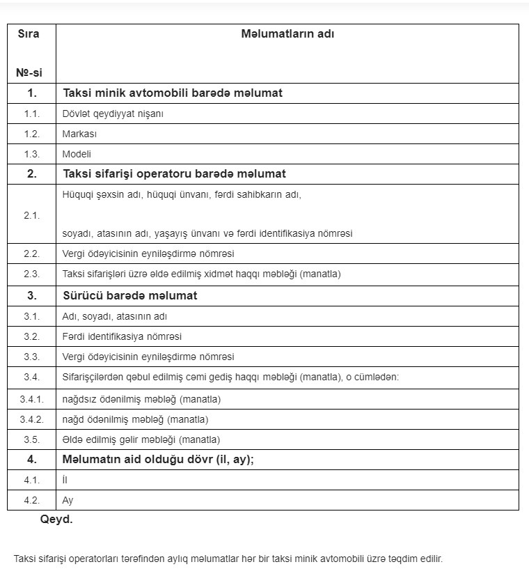 Taksi sifarişi operatorları tərəfindən malik olduqları informasiya sistemi vasitəsilə Azərbaycan Respublikasının İqtisadiyyat Nazirliyi yanında Dövlət Vergi Xidmətinin elektron informasiya sisteminə ötürülməli olan aylıq məlumatların SİYAHISI