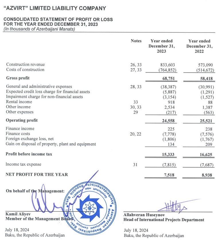 Gəlirin artmasına baxmayaraq xalis mənfəətin düşməsi tikinti işlərinin maya dəyərininin, inzibati və digər xərclərin artması ilə əlaqədardır.