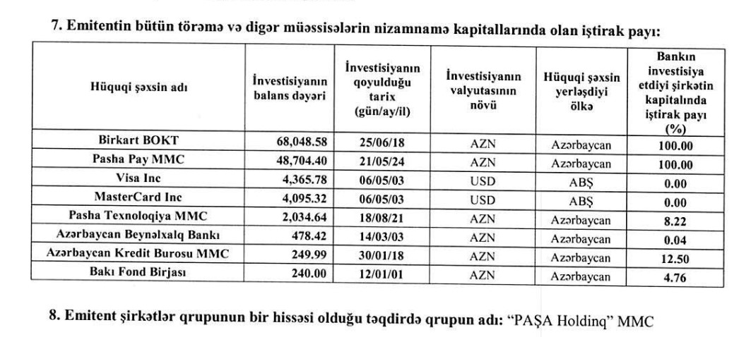 Qeyd edilib ki, "Kapital Bank" 21 may 2024-cü il tarixində "Pasha Pay" MMC şirkətinə 48 milyon 704 min manat investisiya yatırıb.