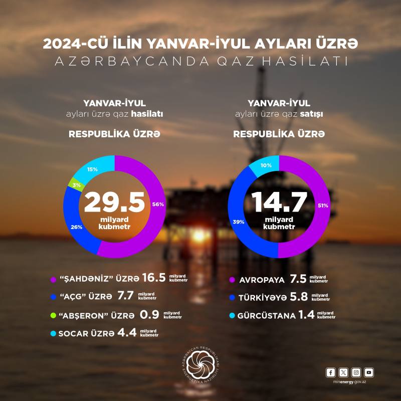 7 ay ərzində ölkədə təxminən 29,5 milyard kubmetr təbii qaz hasil edilib. Qazın 7,7 milyard kubmetri AÇG-dən, 16,5 milyard kubmetri “Şahdəniz”dən, 0,9 milyard kubmetri Abşerondan, 4,4 milyard kubmetri SOCAR üzrə hasil olunub. Ötən ilin müvafiq dövrünə nisbətən qaz hasilatında təqribən 1,3 milyard kubmetr artım qeydə alınıb.