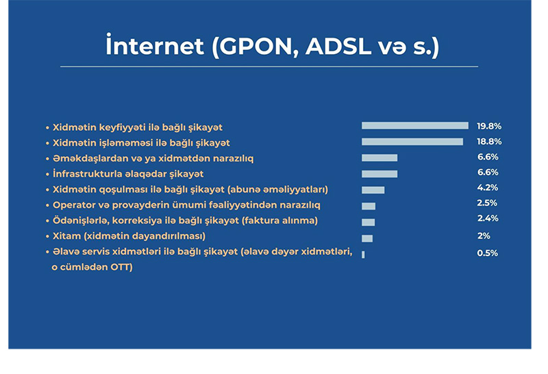 Şikayətlər xarakterinə görə müxtəlif mövzular üzrə qruplaşdırılıb. “İnternet telekommunikasiya xidmətləri (GPON, ADSL və s.)” üzrə ən geniş yayılmış “Xidmət keyfiyyəti ilə bağlı” şikayətlərdir. Bu xarakteristikaya malik şikayətlər ümumi şikayətlərin 19,8%-ni əhatə edir. İkinci yerdə 18,8%-lə “Xidmətin işləməməsi ilə bağlı” şikayətlərdir. “Əməkdaşlardan və ya xidmətdən narazılıq” və “İnfrastrukturla əlaqəli şikayətlər” alt kateqoriyaları üzrə şikayətlərin həcmi 6,6%-ə bərabər olmaqla ilk üçlüyü tamamlayır. Bu dörd xarakteristika üzrə daxil olan şikayətlər ümumi şikayətlərin 51,8%-ni təşkil edir.