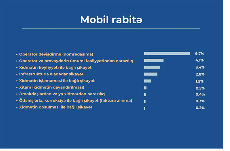 Platforma üzərindən daxil olan şikayətlərin çoxluğuna görə “Mobil rabitə” kateqoriyası ikinci yerdə qərarlaşıb. Belə ki, vətəndaş şikayətləri daha çox “Operator dəyişdirmə (nömrə daşıma)” (9,7%), “Operator və ya provayderin ümumi fəaliyyətindən narazılıq” (4,1%) və “Xidmətin keyfiyyəti ilə bağlı şikayət” (3,4%) alt kateqoriyalarını əhatə edir.