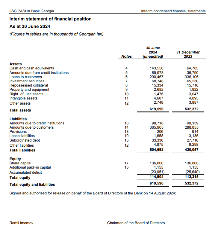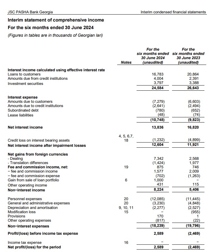 Marja.az Bankın "EY" tərəfindən təsdiq edilmiş 30 iyun 2024-cü il tarixinə Maliyyə Hesabatlarına istinadən xəbər verir ki, 2024-cü ilin 1-ci yarısında "PASHA Bank Georgia"nın faiz gəlirləri 24 milyon 584 min lari (2023-cü ilin ilk 6 ayında 26 milyon 643 lari), qeyri-faiz gəlirləri 8 milyon 224 lari (2024-cü ilin ilk 6 ayında 5 milyon 406 min lari) təşkil edib.
