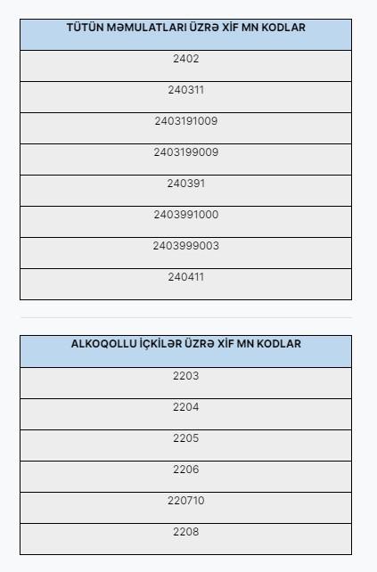 Tranzit daşımaları zamanı təminat tələb olunan alkoqollu içkilərin və tütün məmulatlarının XİF MN kodları ilə aşağıdakı cədvəldən tanış olmaq mümkündür.