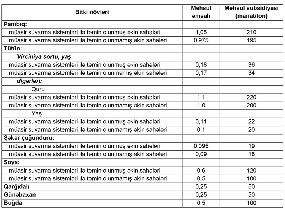Qərara əsasən, baza məbləği 200 manat olmaqla 2025-ci ildə əkin əmsalları və əkin subsidiyasının məbləği kənd təsərrüfatı bitkiləri üzrə aşağıdakı kimi müəyyən olunub:
