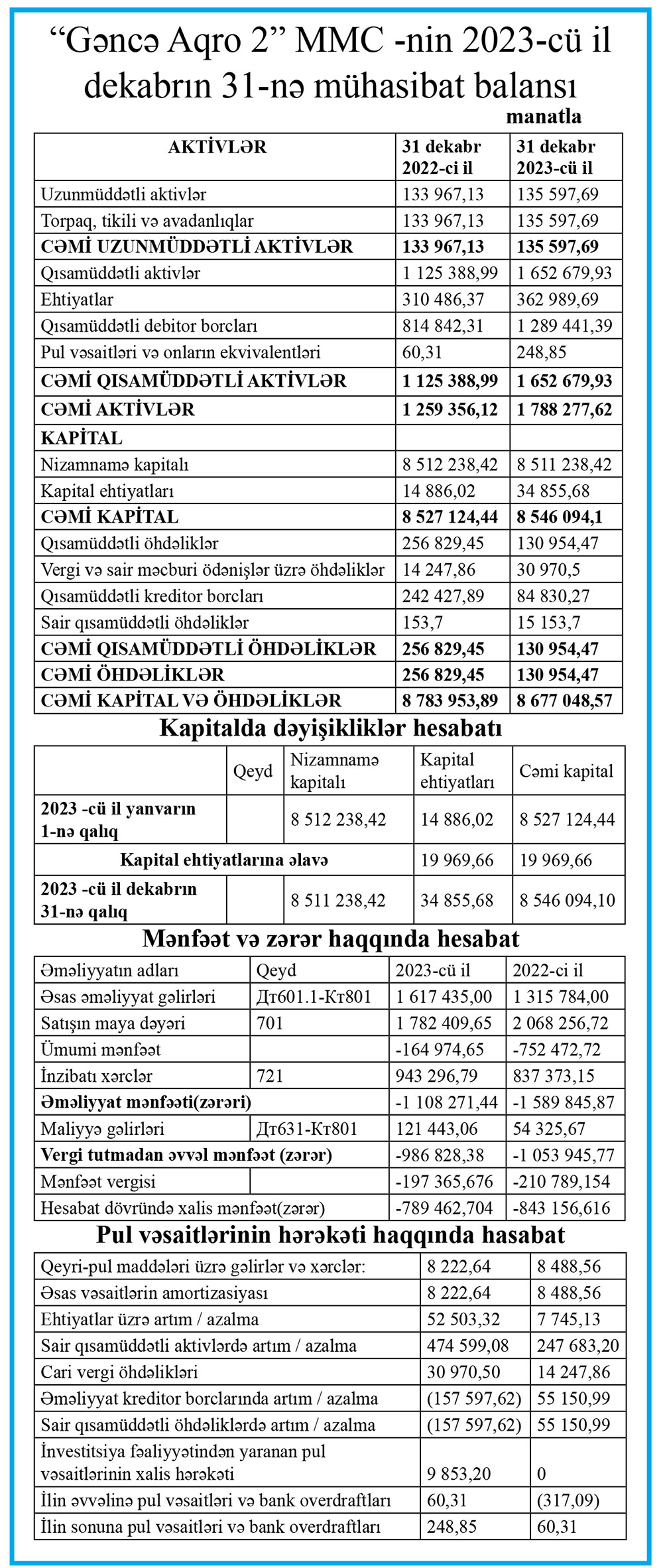 “Gəncə Aqro 2” MMC 2023-cü ili 789 min manat xalis zərər ilə başa vurub. Şirkət 2022-ci ili 843 min manat xalis zərər ilə bağlamışdı.