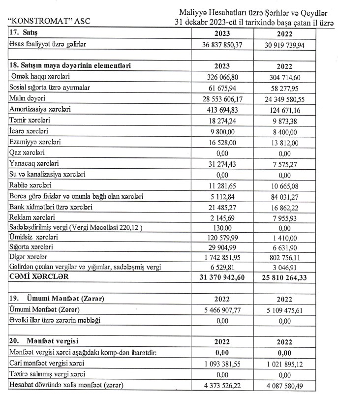Marja.az xəbər verir ki, "Konstromat" ASC-nin əsas əməliyyat gəliri (satış) 2022-ci ildə 30 milyon 920 min manat ikən, 2023-cü ildə 36 milyon 838 min manat yüksəlib (5 milyon 918 min manat və ya 19,1% artıb).