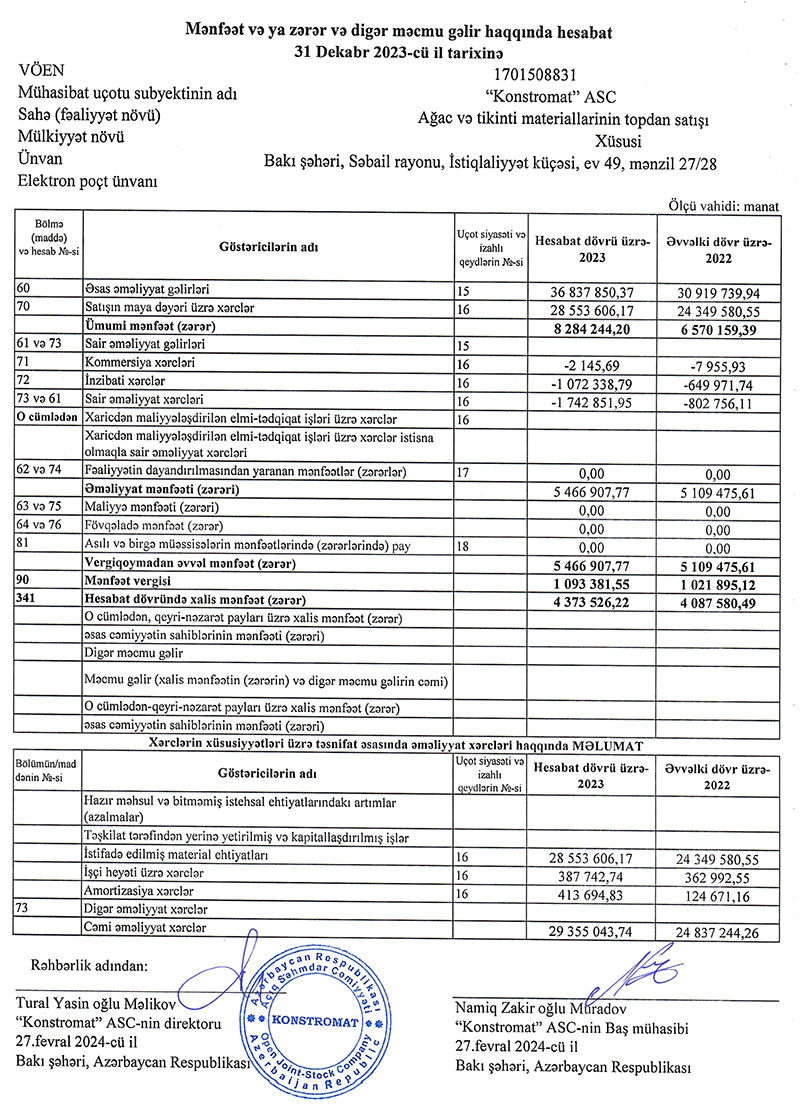 2023-cü ildə "Konstromat" ASC-nin əməliyyat gəlirləri 36 milyon 838 min manat, əməliyyat xərcləri 30 milyon 920 min manat, ümumi mənfəəti 5 milyon 467 min manat təşkil edib. Şirkət ümumi mənfəətindən 1 milyon 93 min manat mənfəət vergisi ödəyib.