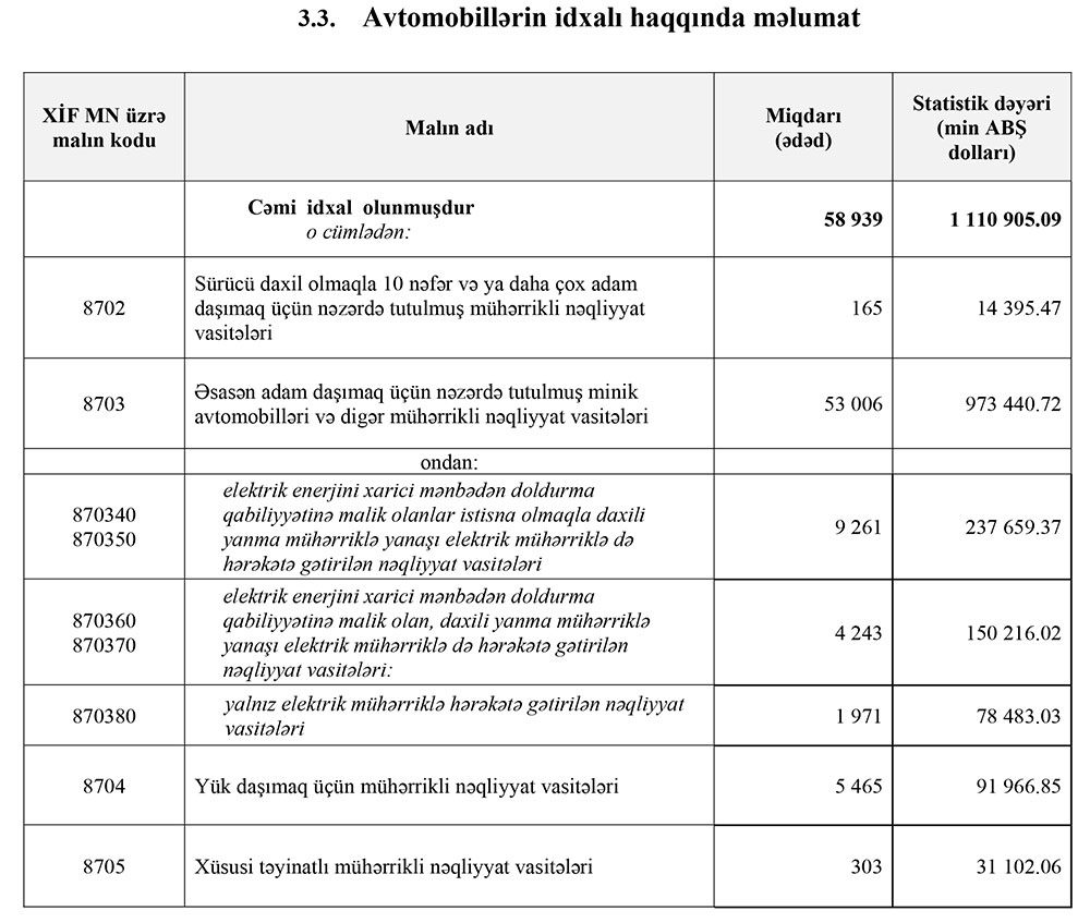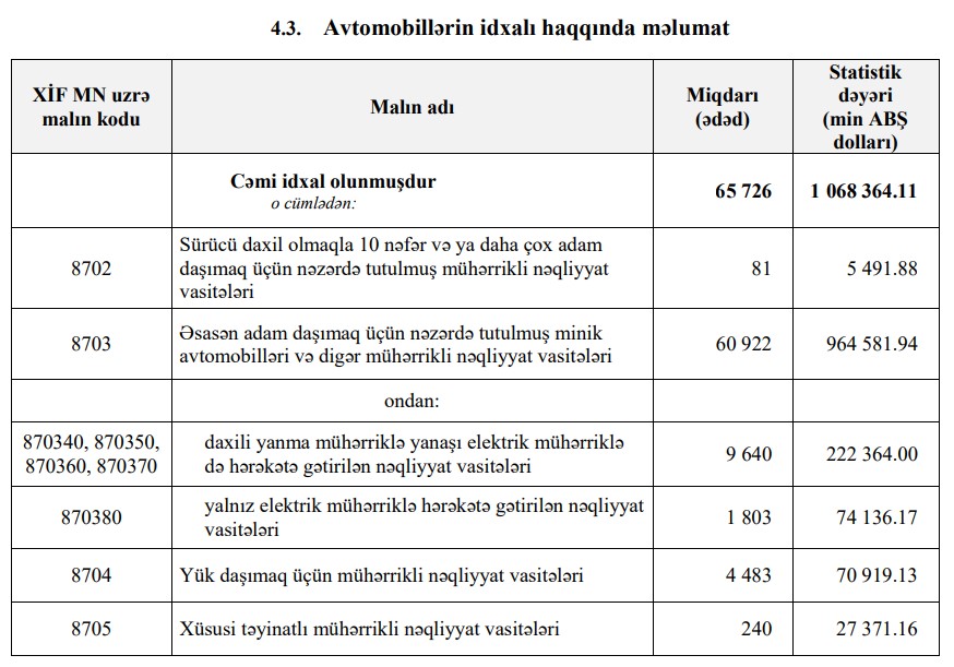 2024-cü ilin 8 ayı ərzində (yanvar-avqust) Azərbaycana 1 milyard 110 milyon 905 min dollar dəyərində 58 min 939 ədəd nəqliyyat vasitəsi (avtomobillər) idxal olunub. Bu, ötən ilin eyni dövrü ilə müqayisədə, dəyər ifadəsilə 42 milyon 541 min dollar və ya 4% çox, miqdar ifadəsilə 6 min 787 ədəd və ya 10,3% azdır.