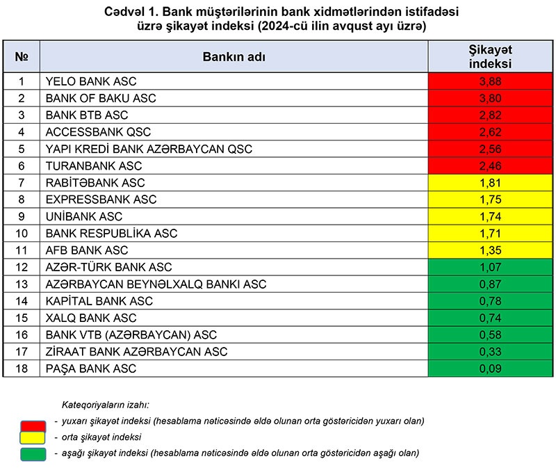 Sarı zona kimi qəbul edilən orta şikayət indeksində isə AFB BANK, BANK RESPUBLİKA, EXPRESSBANK UNİBANK və RABİTƏBANK yer tutublar.