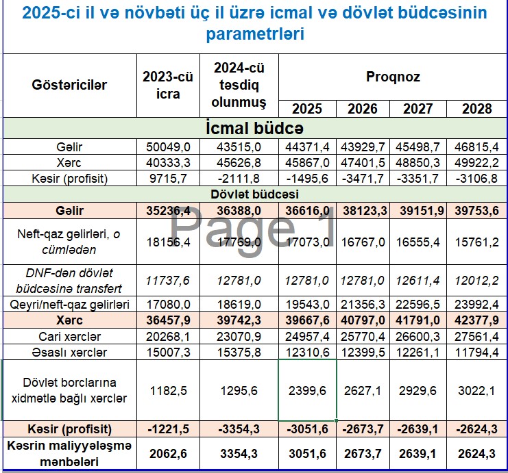 Marja.az xəbər verir ki, açıqlamada 2025-ci il üzrə dövlət və icmal büdcələrin proqnozu da yer alıb.