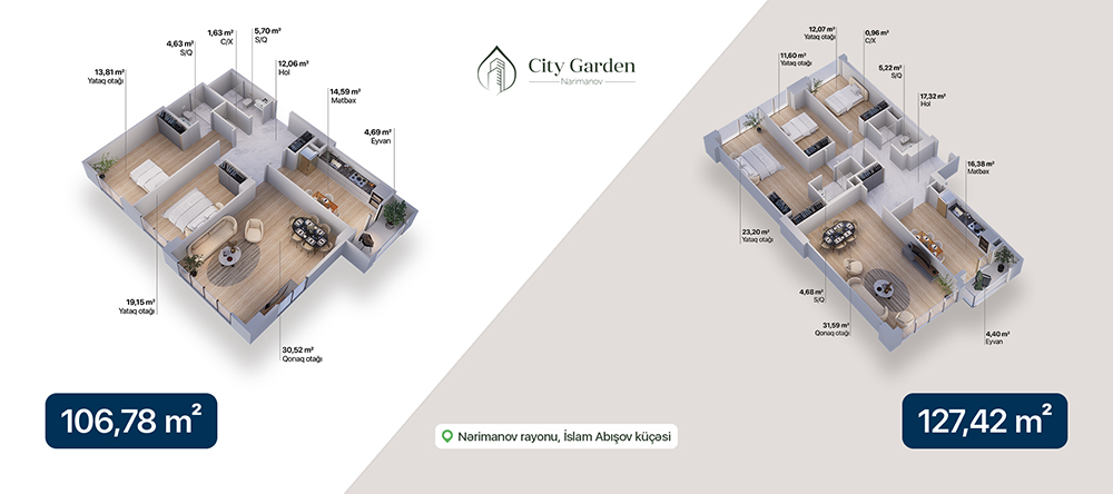 Qeyd edək ki, layihədə optimal şəkildə planlanmış müxtəlif mənzil seçimləri, o cümlədən 106.78 kv.m-lik 3 otaqlı və 127.42 kv.m-lik 4 otaqlı mənzillər təklif edilir. Bu mənzillər geniş yaşayış sahəsi və rahatlıq təmin edir və böyük ailələr üçün ideal seçimdir.