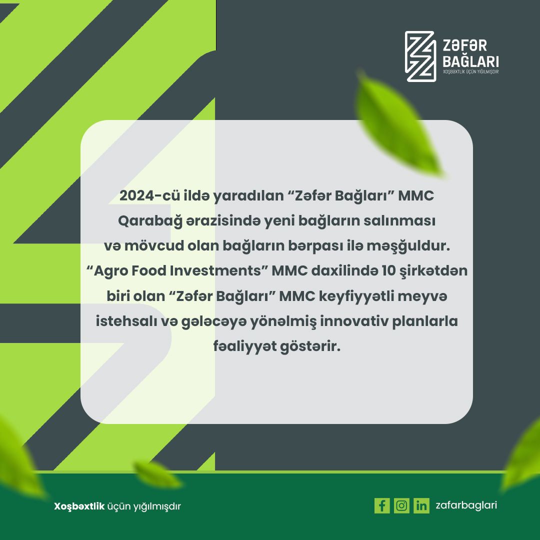 "Agro Food Investments" MMC daxilində 10 şirkətdən biri olan "Zəfər Bağları" MMC keyfiyyətli meyvə istehsalı və gələcəyə yönəlmiş innovativ planlarla fəaliyyət göstərir.